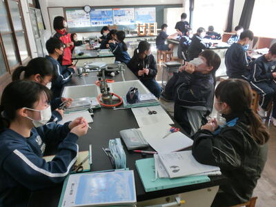 1年生理科の様子。「音」の単元に入りました。「どのようにしたらストローから笛のように音が出るか」。いろいろと試行錯誤しながら試しました。そして、「どこから音が鳴っているのか」について考え、これからの学習につなげます。みんな、一生懸命音を鳴らそうと頑張っていました。