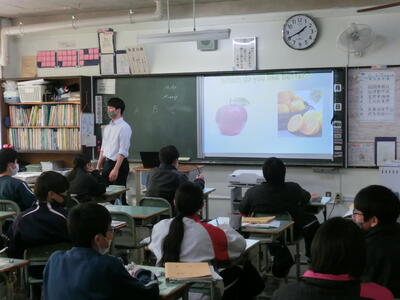 2年生英語の様子です。「比較級」の学習です。2つ、3つと自分が好むものを選ぶ選択肢を与え、英語で表現します。画面には「りんご(apple)」と「オレンジ(orange)」が示されています。