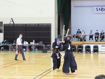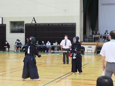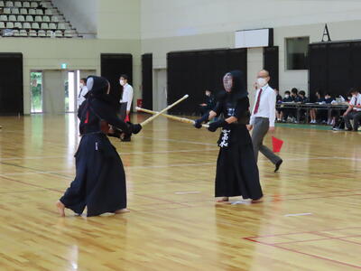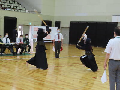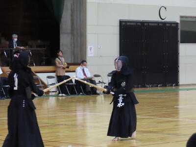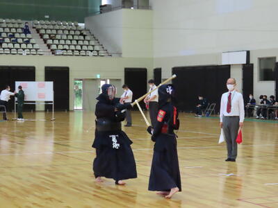 男子は、トーナメント戦。団体戦は5人で戦いますが、本校は、3人での出場のため、3人が勝利するが、2人が二本先取で勝利し1人が引き分け、代表戦で勝つ以外に勝ち進むことはできないハンデを背負っています。