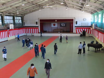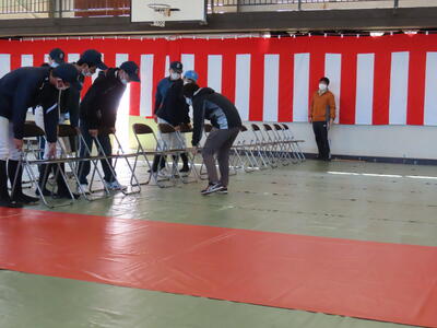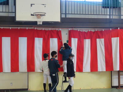本日は、午前中に始業式。午後に入学式が行われます。昨日、部活動に参加していた生徒たちの力をかりて、式場作成を行いました。