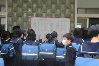登校した生徒たちは、クラス発表に緊張しながら昇降口に集まっています。