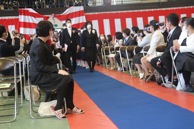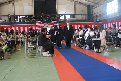新入生退場。入場の時よりも、緊張が解けている様子が見られました。(担任も同じ気持ちでしょうか。)