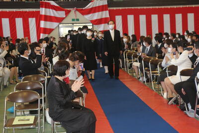 令和4年度 入学式のスタートです。感染症対策を徹底し、保護者の方々が見守る中、新入生160名が、担任を先導に堂々と入場しました。