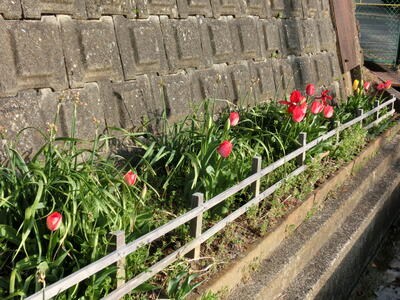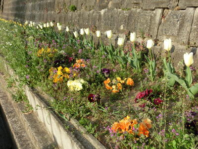 生徒を迎える花壇にも、花々が色とりどりに咲いています。