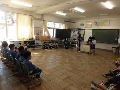 2/28(火)、西小名浜幼稚園の年長の子どもたちが、1年生の教室を訪問しました。年長の子どもたちは1年生の発表をしっかり聞いていました。