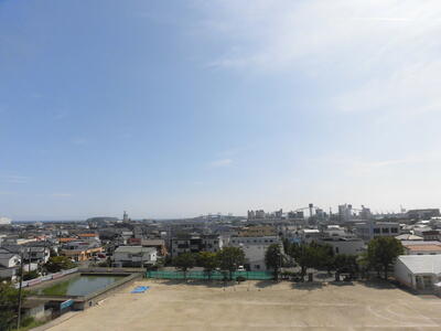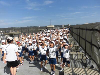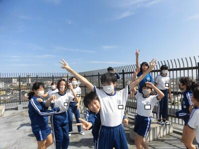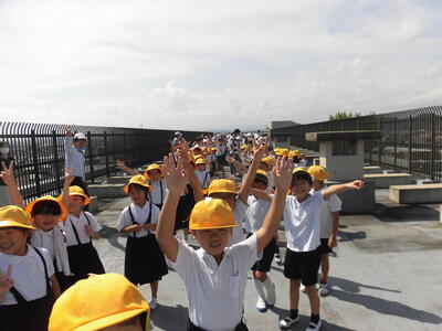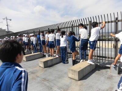 はじめて屋上に出たという児童も多く、大はしゃぎでした。(普段はきちんと施錠してあるために,屋上にでることはできません)