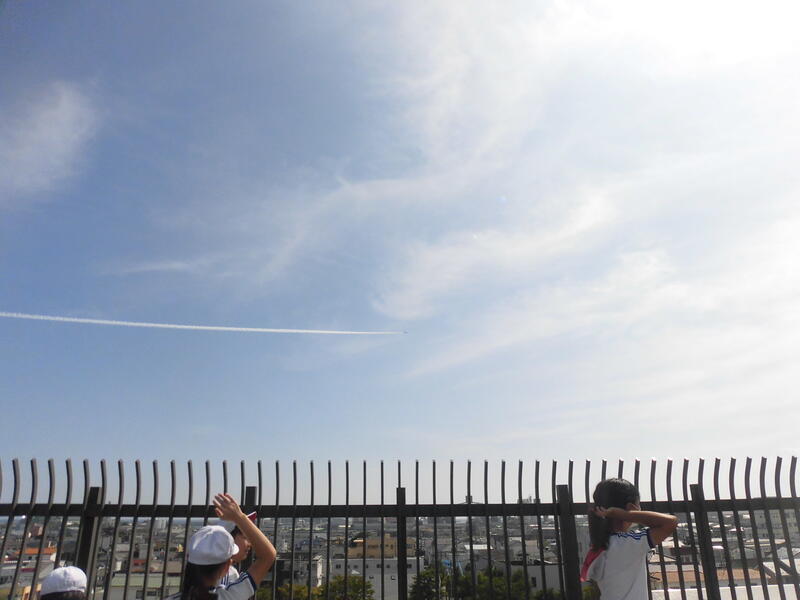 2023年9月14日 13時35分本日、アクアマリン上空をブルーインパレスが飛行すると保護者の方から教えていただき、お昼休みの時間に全校生でブルーインパレスを屋上から見学しました。(二小の屋上は、津波避難ビルになっているために、きちんとフェンスがあり安全面でも問題ありません。実際に津波の時の本校の最終避難場所は屋上になっています。)