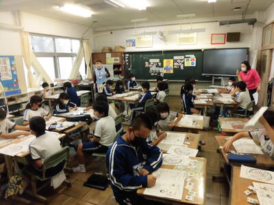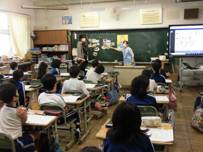 授業風景 2021年10月26日 15時04分 10/26(火),3年生と6年生が食に関する学習をしました。子どもたちは,小名浜学校給食共同調理場の講師の先生方の話をよく聞いて,食について学ぶことができました。