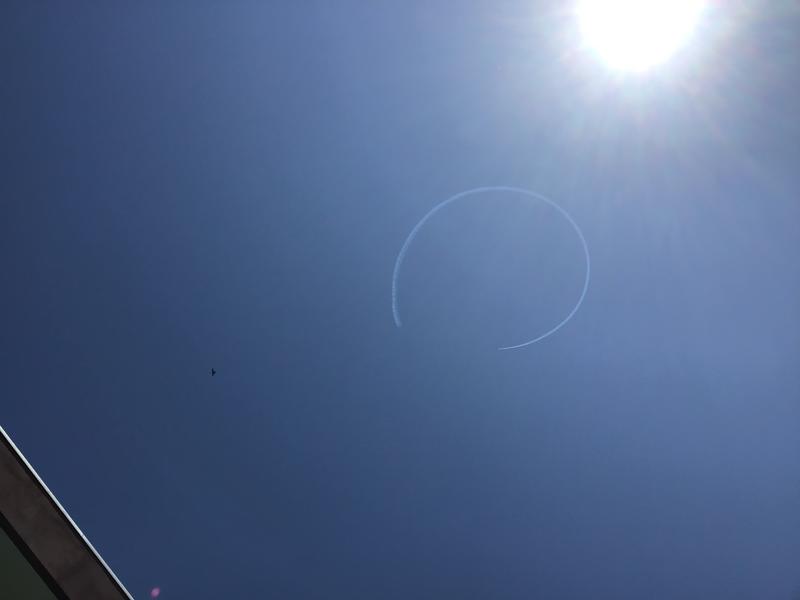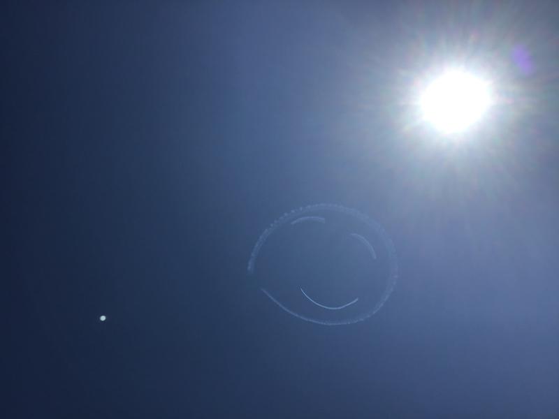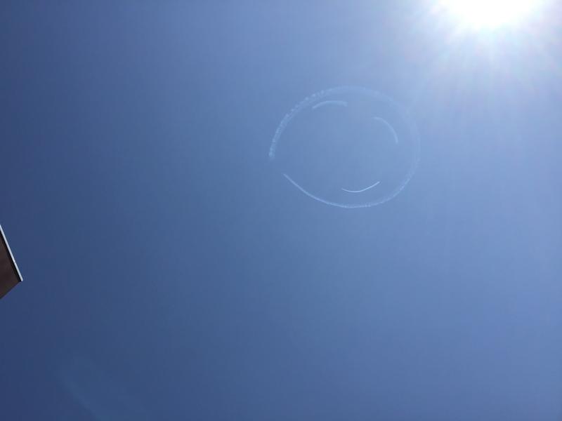 本日9日(火)にエアロバティック・パイロット室屋義秀さんが県内上空を飛び、飛行機のスモークで笑顔を描く「Fly for ALL #大空を見上げよう」が実施されました。予定された時間になると飛行機の音が近くで聞こえるも、見えるのはツバメばかりでした。しばらくすると校庭にいる生徒の歓声で真上にその姿が見えました。上空を小型プロペラ機で巡り、白のスモークで笑顔を表す「ニコニコマーク」をきれいに描いてくれました。僅かな時間でしたが、記憶に残るものとなりました。元気を届けてくてありがとうございました。
