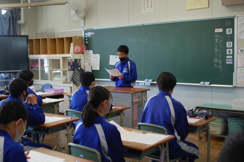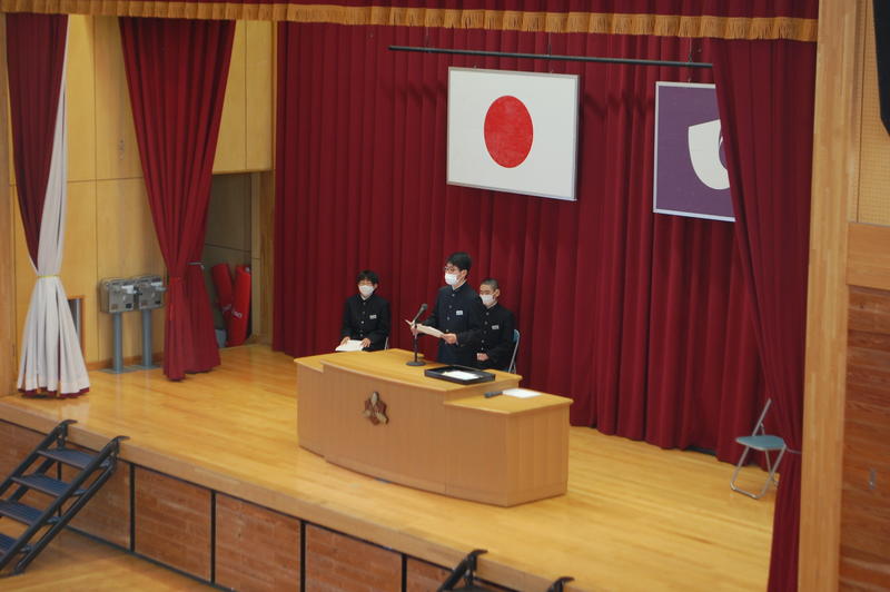 「2学期の反省と冬休みの過ごし方」について各学年の代表生徒がスピーチをしている場面です。