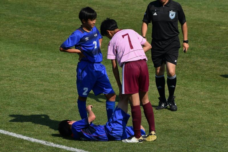 対戦相手チームの選手が、試合途中で足をつってしまった際に、心配して駆け寄り、足を伸ばしているところです。