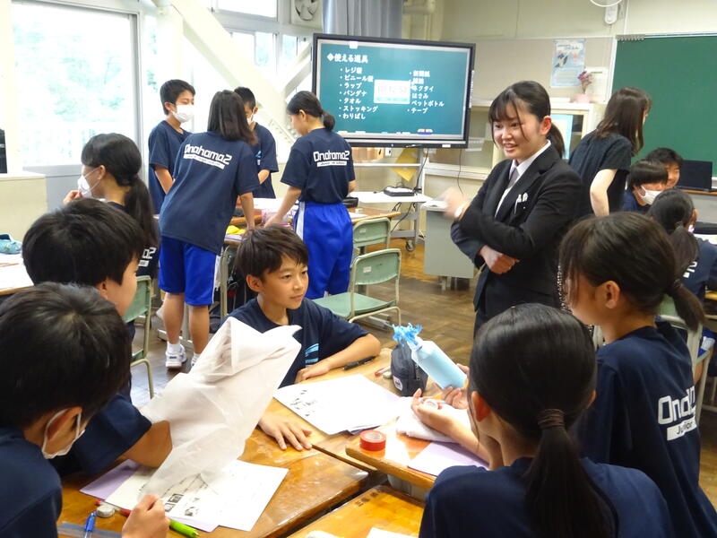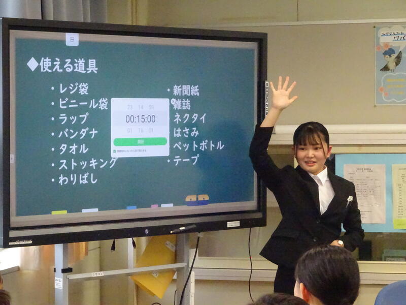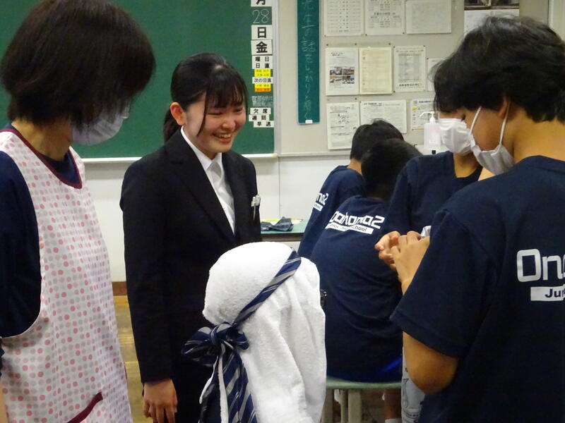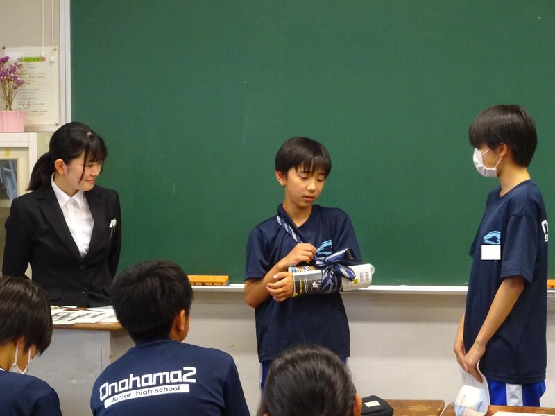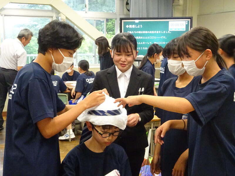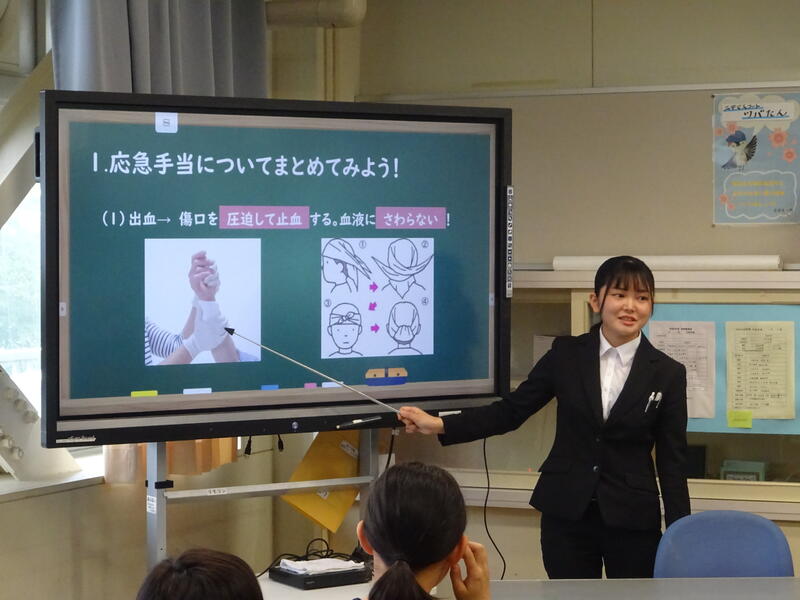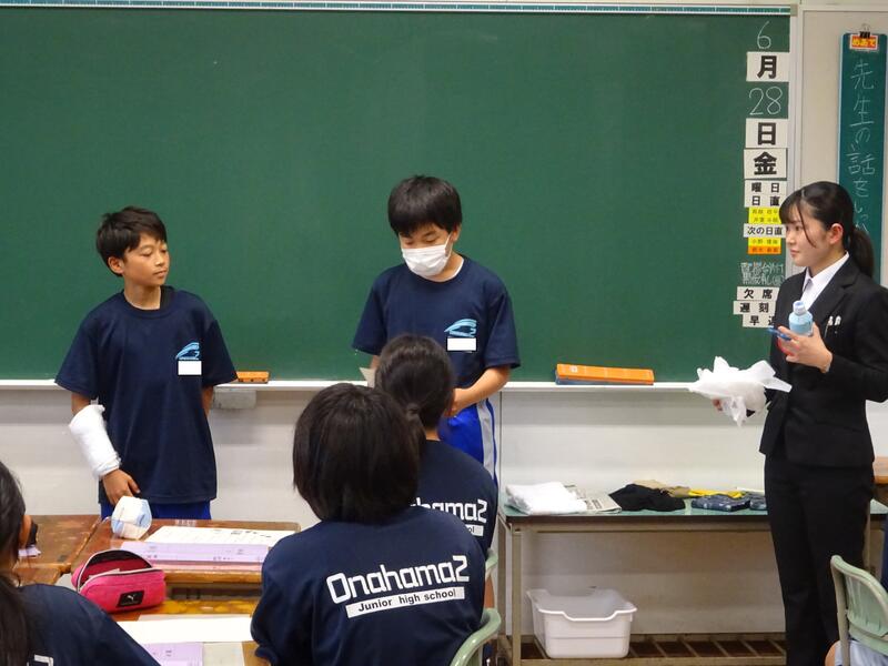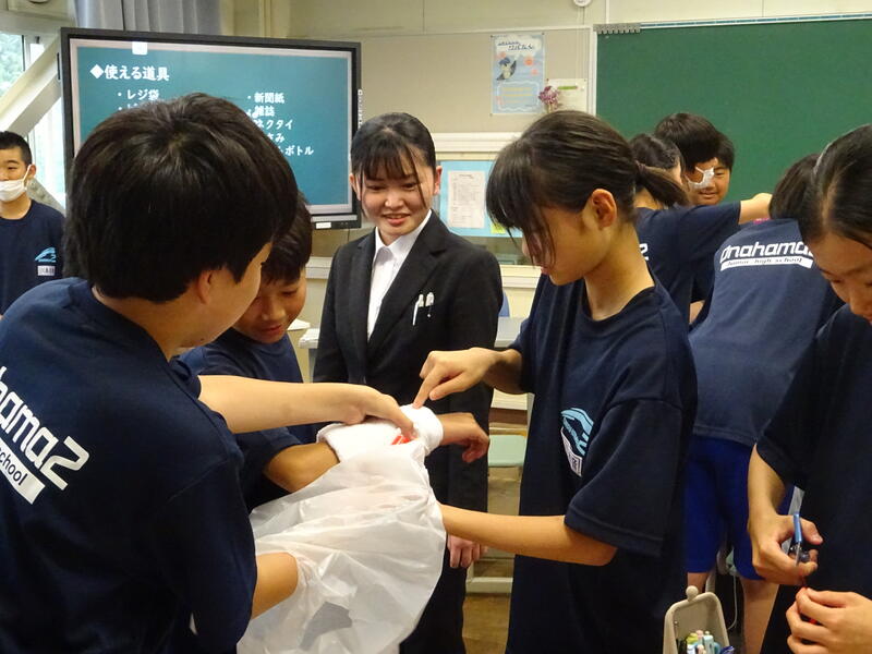 〇グループごとに工夫しながら、応急手当を考えていました。実習生の先生も生徒たちの様子を見ながら、適切にアドバイスを与えていました。
