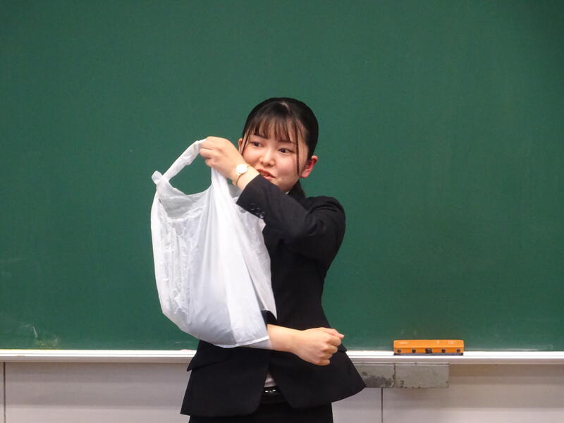 〇先生からも、違う応急手当の方法も紹介されました。レジ袋が包帯の代用品になるようです。