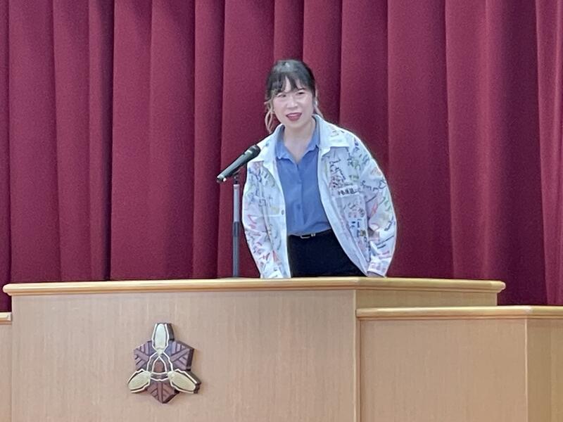 日本語で全校生徒にあいさつをしました。