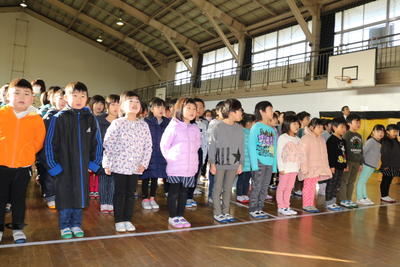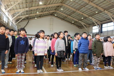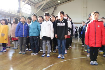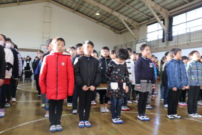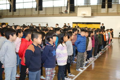 寒い中、しっかりと校長先生のお話のお話を聞いています。