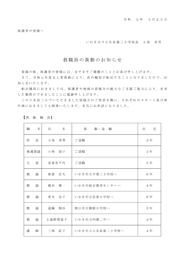 さて令和元年度の人事異動が発表されました。本校でも9名の先生方がご退職、ご異動されますのでお知らせいたします。人事異動のお知らせ_1.jpg