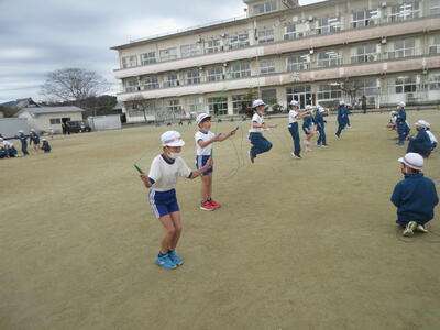 縄跳びでは、順跳びや駆け足跳びなどに挑戦しました。