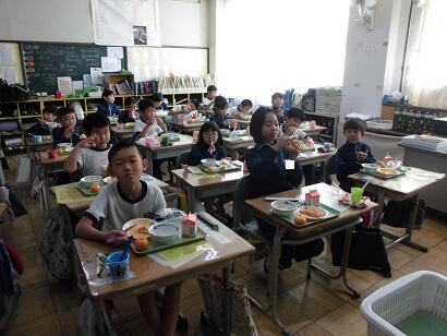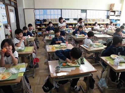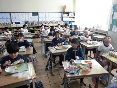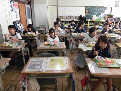 給食は3年生の様子です。今日のデザートのミカンは、甘くてとてもおいしかったです。