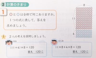 赤が8列11行、青が8列4行、全部で何個かを説明した2つの考えを比べます。
