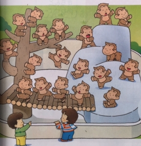 動物園のサル山のイラストから、足し算・引き算の問題を作ります。