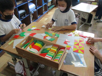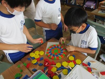 三角形や四角形などの形に注目し、綺麗な敷き詰め模様を作ることができました。