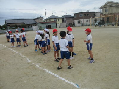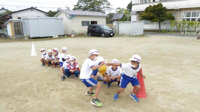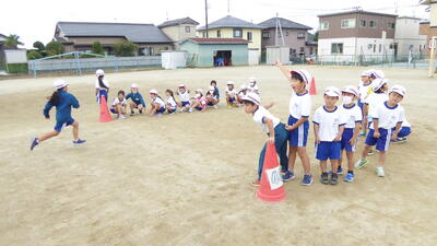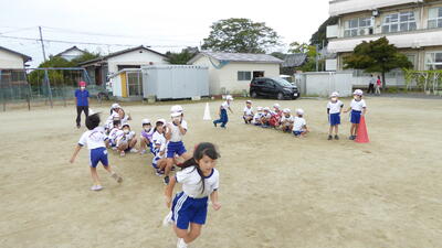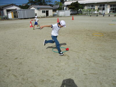 バトンを渡したり、お手玉を移動させたりしながら、折り返しリレーを行いました。