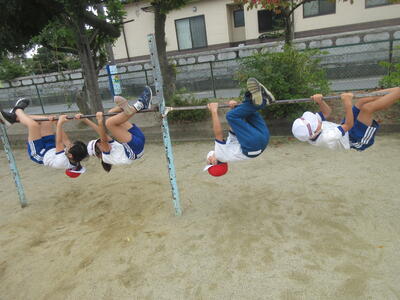 握り方に気をつけながら、豚の丸焼きや自転車こぎ、前回り等を行いました。