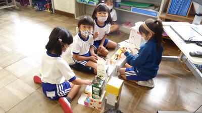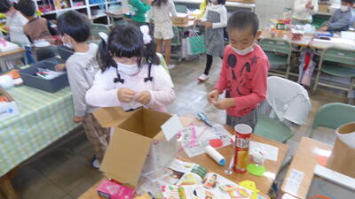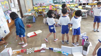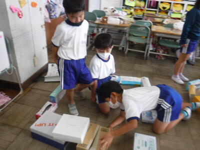 先週の図画工作では、「いっぱいつかってなにしよう~はこで」を行いました。