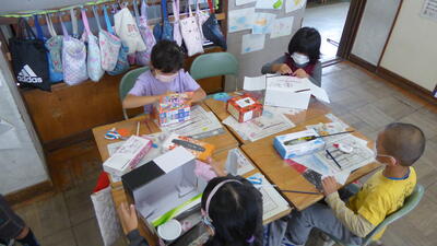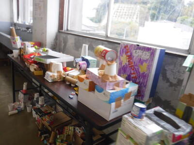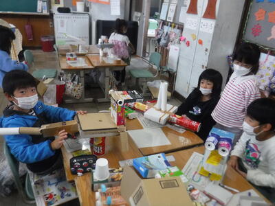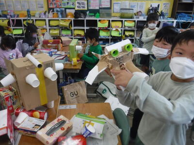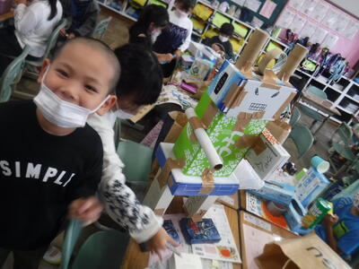 持ってきた箱でやイレットペーパーの芯などの廃材で思い思いの物を作りました。