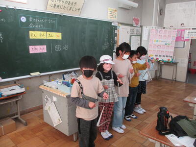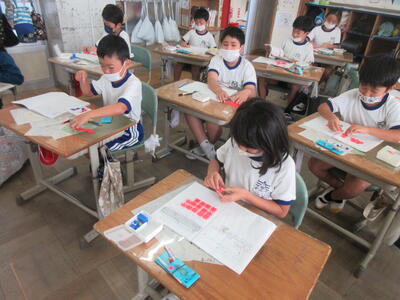 かけ算の式になるように、おはじきを並べたり、それを見せ合って、友達が考えた式を答えたりしました。