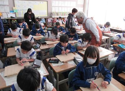公民館とのパートナーシップ連携事業の一環として彫刻の講師をお招きして指導をしていただきました。4年1組と2組の子どもたちが対象でした。彫刻刀を初めて使用したので子どもたちは慎重に取り組みました。
