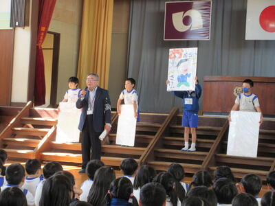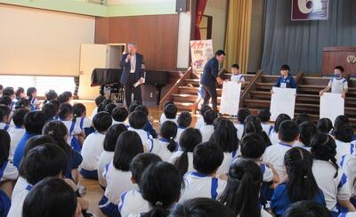 次に、子どもたちが体育館で不審者・声かけ事案の対応や、ネットトラブルについての対応について講話をいただきました。