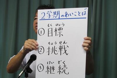 2学期は1年で1番長い学期です。「目標」「挑戦」「継続」の言葉を大切に頑張っていきましょう。