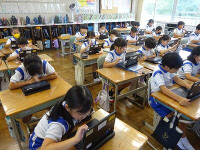 火曜日の朝は「算数タイム」の時間です。子どもたちは、タブレットやプリントで算数の問題を解いていました。