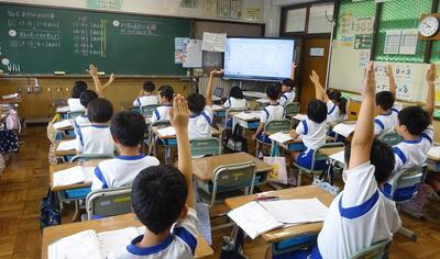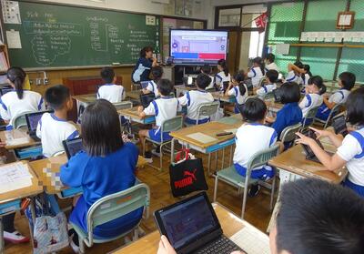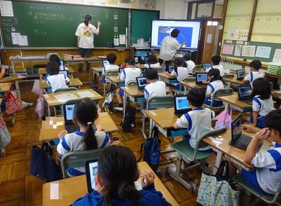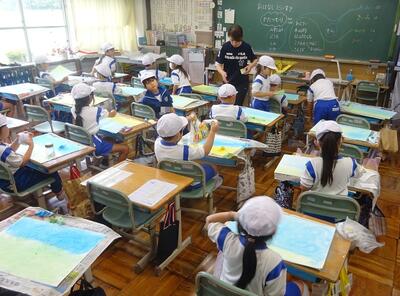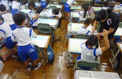 2年3組は、タブレットで夏休みの思い出の絵を描いていました。