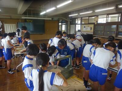 5年2組は、糸のこぎりを使って図工の作品づくりに励んでいました。