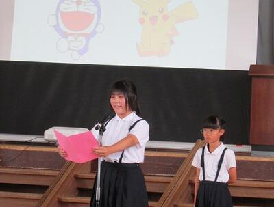 続いて、2・4・6年生の代表児童が1学期の思い出と夏休みの目標を発表しました。3人とも堂々とした内容のある発表で感心しました。