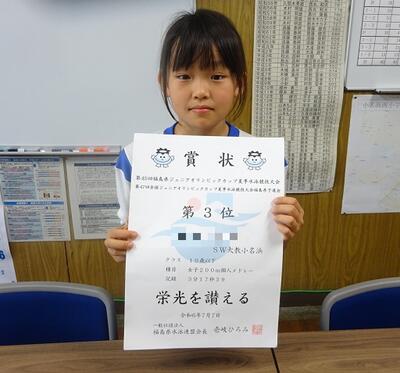 昨日のお昼、4年生の女子が校長室を尋ねてきました。話を聞いてみると「水泳で頑張ったので見てほしくてきました。」と笑顔で答えてくれました。福島県ジュニアオリンピックカップ夏季水泳競技大会の10歳以下女子200m個人メドレーにおいて第3位に輝いたとのことです。素敵ですね。西小の子どもたち、様々なことで輝いています。