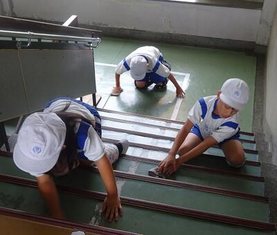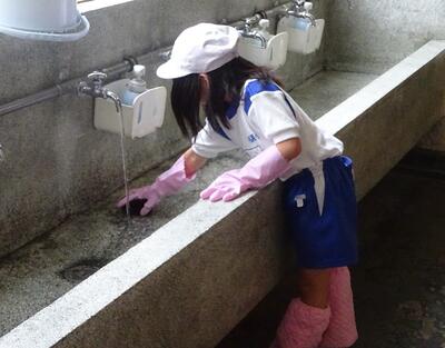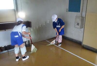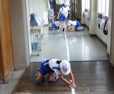 見てください。本校の床掃除は「拭く」ではなく「磨いて」います。両手で力を込めて掃除している姿が素敵ですね。