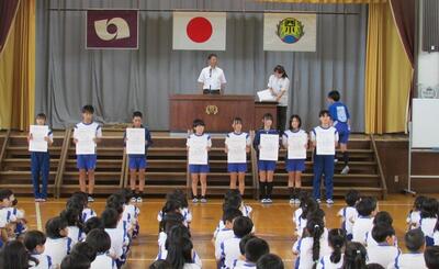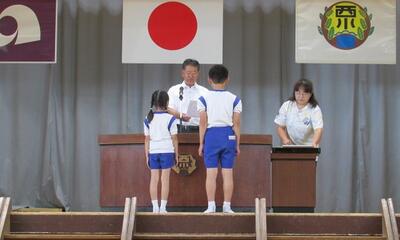 大休憩に全校集会が行われました。まず最初に表彰がありました。「歯と口の健康週間」標語コンクール・水道週間絵画展において優秀な成績をおさめた子どもたちの表彰でした。