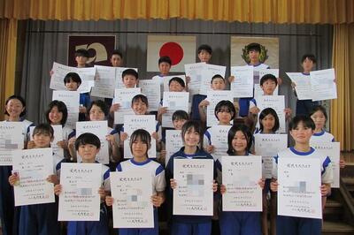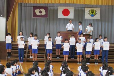 次に、先日行われた陸上競技大会(6年)の表彰でした。多くの子どもたちが賞状を手にしました。