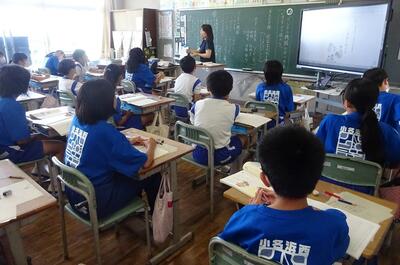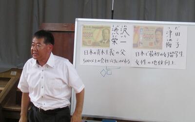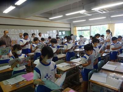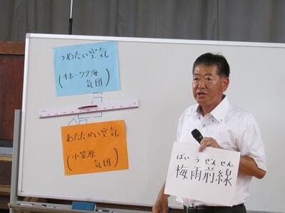 最後に、校長先生から「梅雨のメカニズム」と「新紙幣」についてのお話がありました。湿気の多い天候でしたが、全員が最後までしっかり話を聞いていました。
