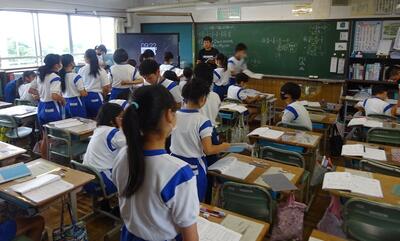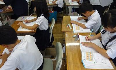 6年1組は、外国語でヒヤリングに挑戦していました。