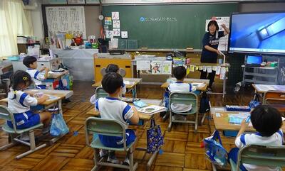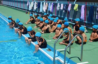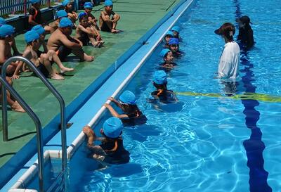 1年生が西小学校のプールに初めて入りました。