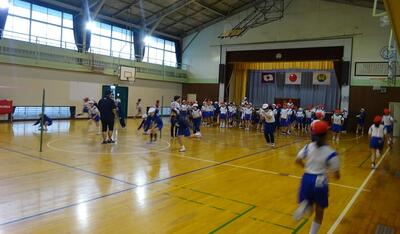 4年生は、合同体育で運動身体づくりプログラムやソフトバレーに取り組んでいました。