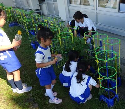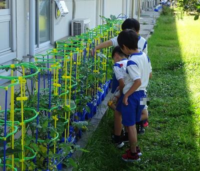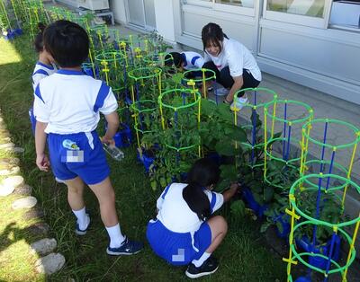 2年生が植えた苗が大きくなりました。ピーマンやなす、きゅうりなどは家に持って帰れるほど大きく成長しました。「やったー、ミニトマトができてる。」「葉っぱの下にピーマンが隠れていた。」などうれしい声が響いていました。