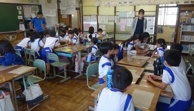 4年1組は、投げる力を高めるためにタオルを使って投げる練習をしていました。