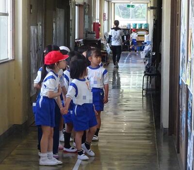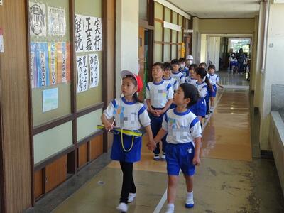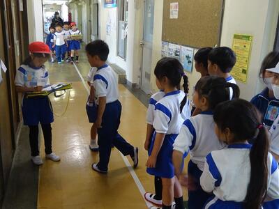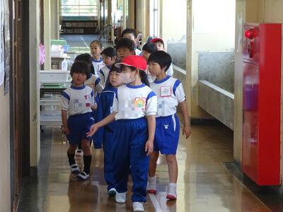 学校探検が行われました。2年生が1年生を紹介して校舎内を歩きました。