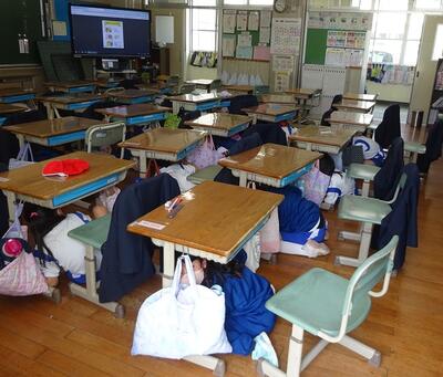 避難訓練が行われました。地震を想定した訓練だったので机の下に入って安全を確保しました。