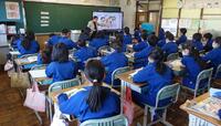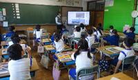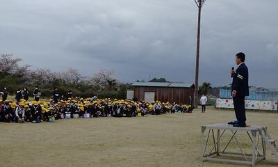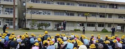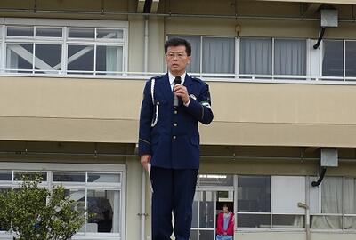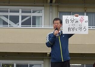 交通教室と一斉下校が校庭で行われました。校長先生からは、「自分の命は自分で守る」ことの大切さが話されました。